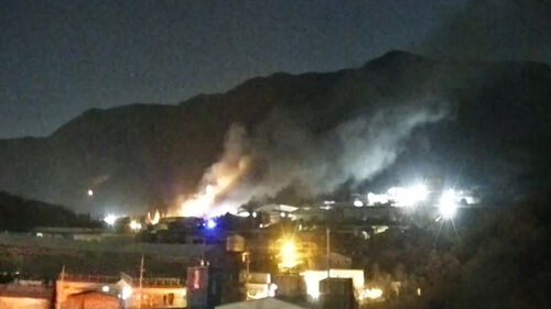화재 현장에서는 두꺼운 연기가 하늘로 치솟고 있으며, 불길이 여전히 강하게 타오르고 있는 모습이 확인됩니다.