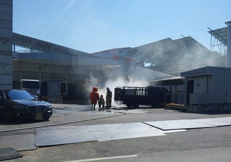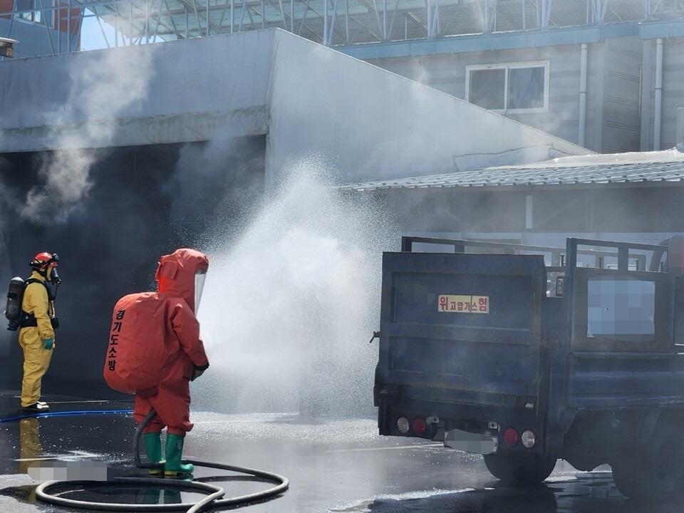 사고 현장에서는 소방대원들이 화학물질 누출을 막기 위해 분주히 움직이고 있었어요. 한 소방관은 밝은 빨간색 보호복을 입고 물을 뿌리며 상황을 관리하고 있었고, 다른 대원은 노란색 보호복을 입고 상황을 모니터링하고 있었죠.
