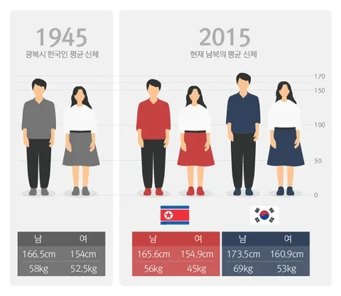 한국의 평균 키는 시간이 지남에 따라 변화해왔습니다. 1945년과 2015년의 평균 키를 비교해보면, 남성의 경우 166.5cm에서 173.5cm로, 여성의 경우 154cm에서 160.9cm로 증가했습니다. 이는 한국 사회의 전반적인 생활 수준 향상과 관련이 있습니다.