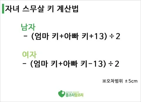 부모의 키는 자녀의 키에 상당한 영향을 미칩니다. 일반적으로 아버지와 어머니의 키를 바탕으로 자녀의 키를 예측할 수 있는 공식이 있습니다. 남자의 경우, (어머니의 키 + 아버지의 키 + 13) ÷ 2로 계산하고, 여자의 경우 (어머니의 키 + 아버지의 키 - 13) ÷ 2로 계산합니다. 이 공식은 대략적인 예측을 제공하지만, ±5cm의 오차가 있을 수 있습니다.